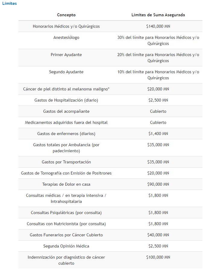 * En Gastos Totales por Cáncer de Piel, el melanoma maligno se cubrirá con la suma asegurada completa de Cáncer, cualquier otro Cáncer de Piel hasta $20,000 MN